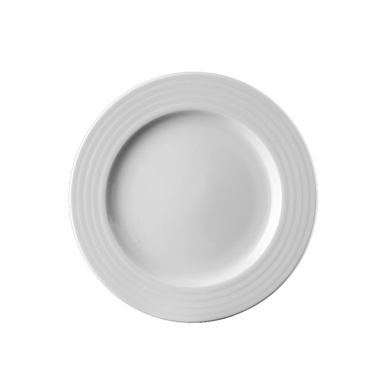 Flacher Teller mit 26 cm Durchmesser und Relief am Rand.