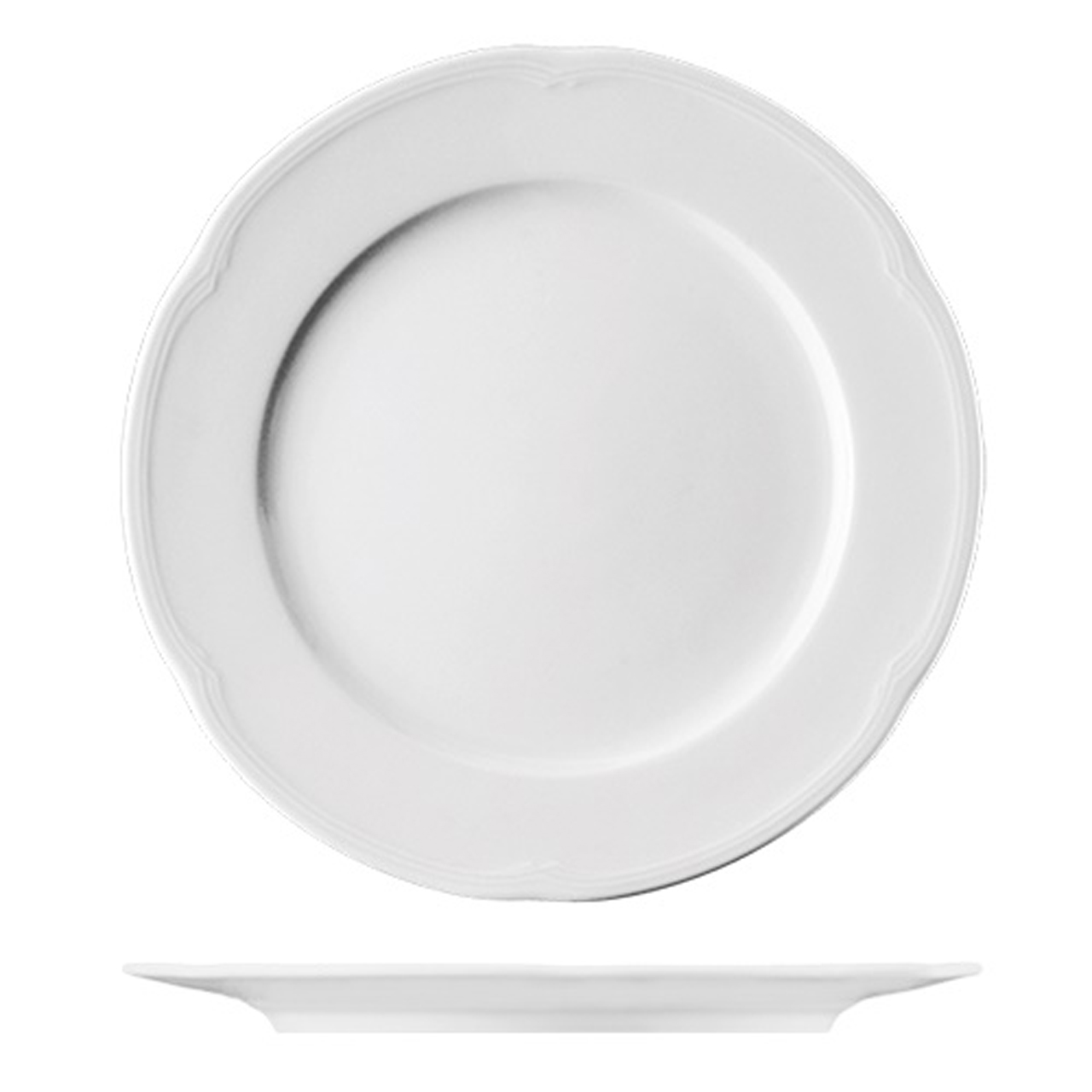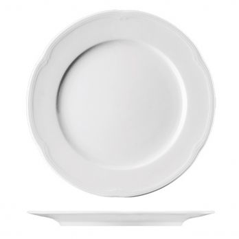 Ein flacher Teller mit 31 cm Durchmesser aus ARCADIA-Porzellan mit sanfter Rundung, der sich ideal in historisch eingerichtete Interieurs und Restaurants im Retro-Stil einfügt.