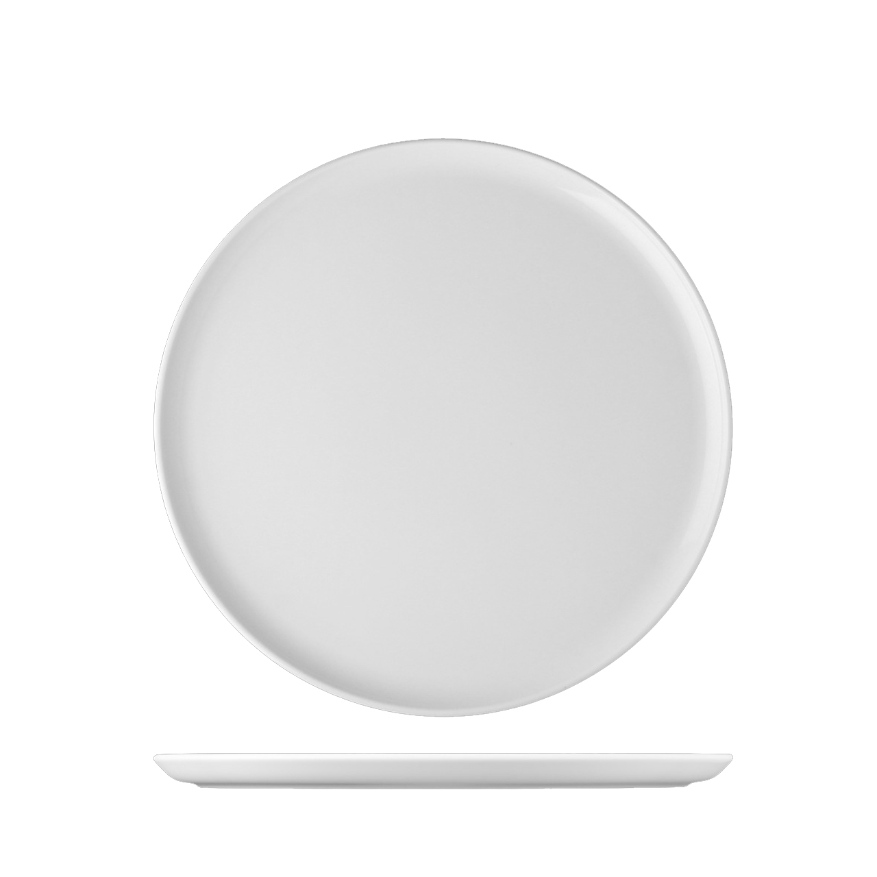 Flacher Teller mit 23 cm Durchmesser, ohne Rand und mit flachem Boden.