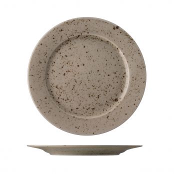 Flacher Teller mit 26 cm Durchmesser und Rand. Originelles Dekor dank einzigartiger Fertigungstechnologie.