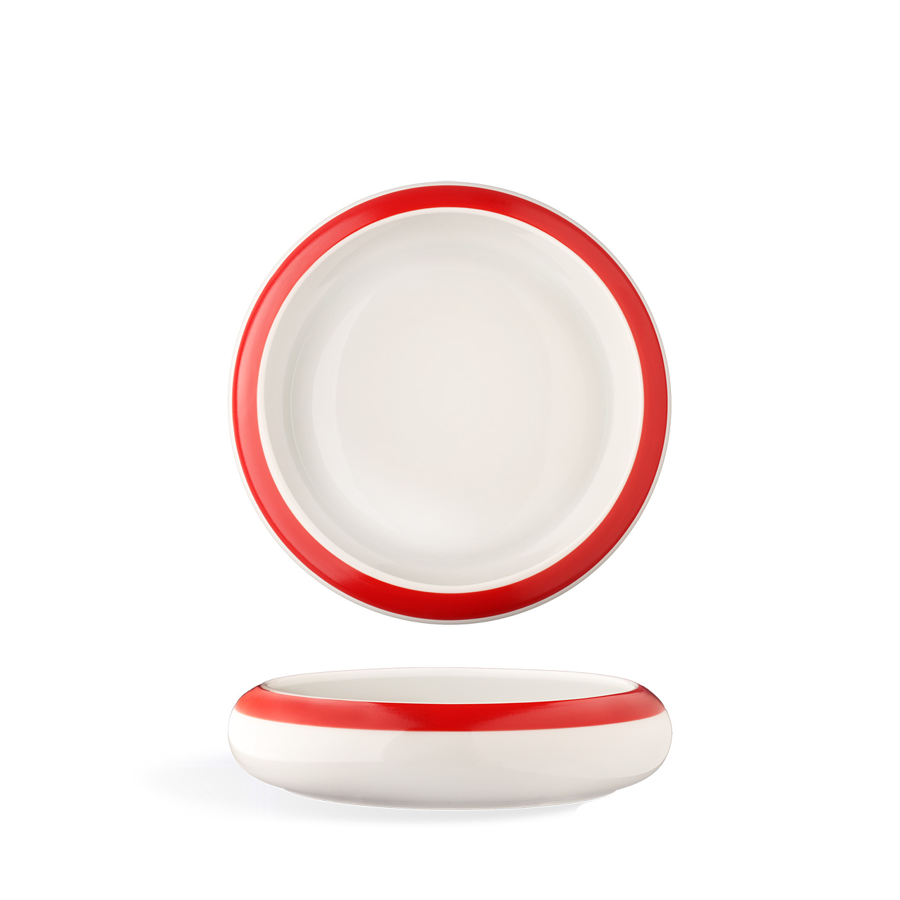 Tiefer Teller/Suppenschüssel mit 17 cm Durchmesser und rotem Dekor. Dank besonderer Details wie kontrastierenden Farben und Absenkungen für leichteres Abbeißen ist das ACTIVE-Porzellan ideal für Menschen mit motorischen Einschränkungen und Senioren.