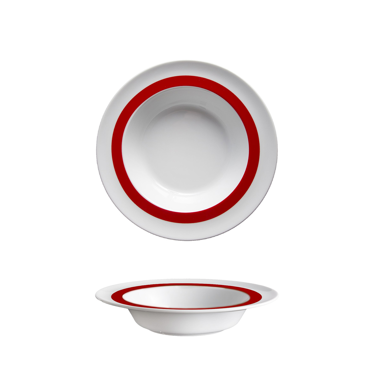 Tiefer Teller mit 23 cm Durchmesser und rotem Dekor. Dank besonderer Details wie kontrastierenden Farben und Rillen zum leichteren Aufnehmen von Bissen ist das ACTIVE-Porzellan speziell für Menschen mit motorischen Einschränkungen und Senioren entwickelt worden.