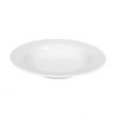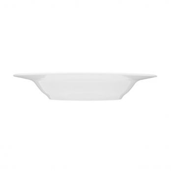 Ein tiefer Teller mit einem Durchmesser von 23 cm und einem breiteren Rand. Luxuriöses weißes Porzellan.