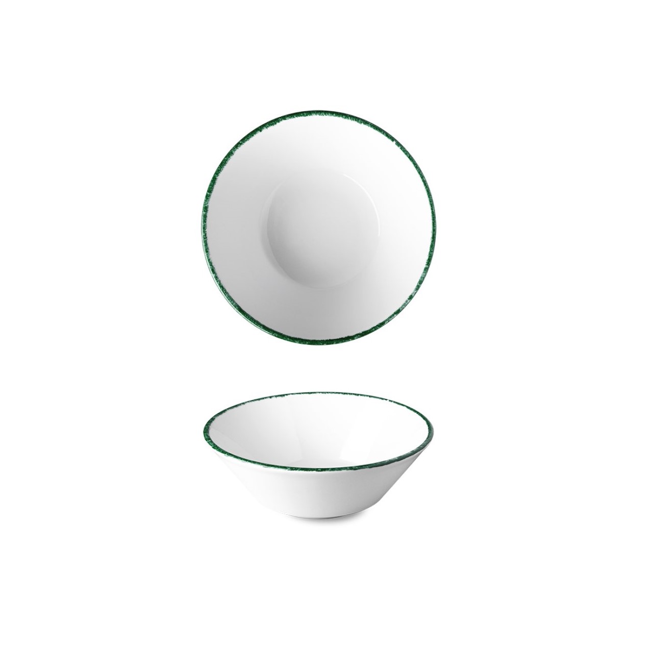 Weiße, konische Schale aus der Porzellanserie OPTIMO mit grünen Linien.