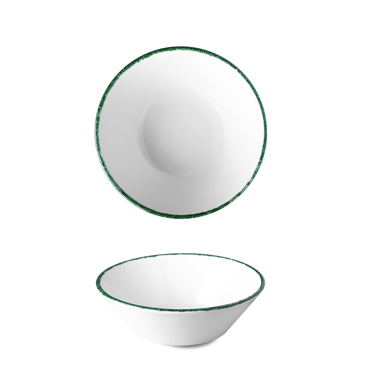 Weiße, konische Schale aus der Porzellanlinie OPTIMO mit grünem Zierstreifen. Der Durchmesser der Schale beträgt 19,3 cm.