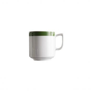 Becher/Tasse mit einem Volumen von 0,3 l, Henkel und grünem Rand.
