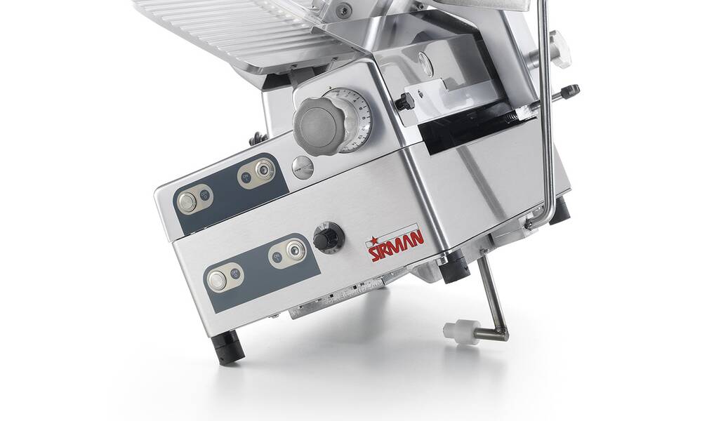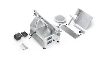 Náøezový stroj PALLADIO AUTOMEC 300 s nerezovým nožem o prùmìru 300 mm s uložením posuvného stolu našikmo, od italského výrobce SIRMAN.- vhodný do velkých restaurací, jídelen a supermarketù