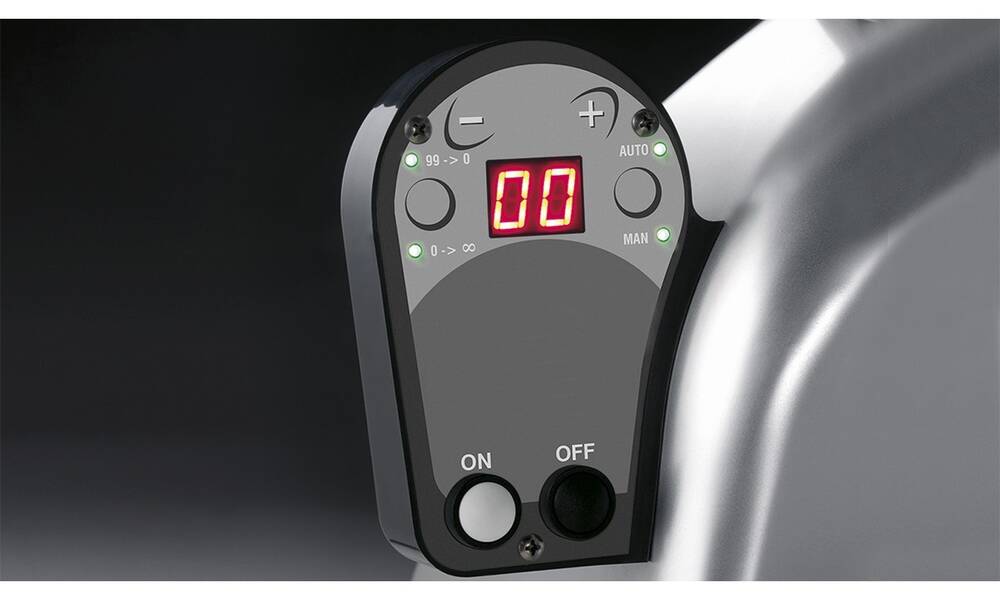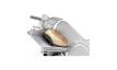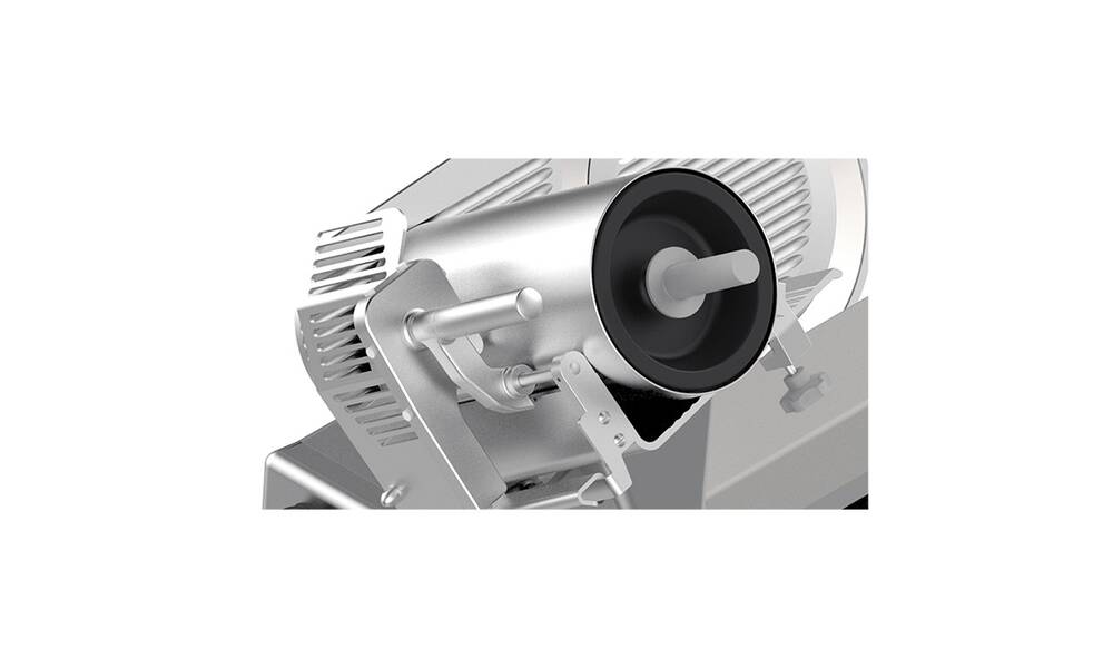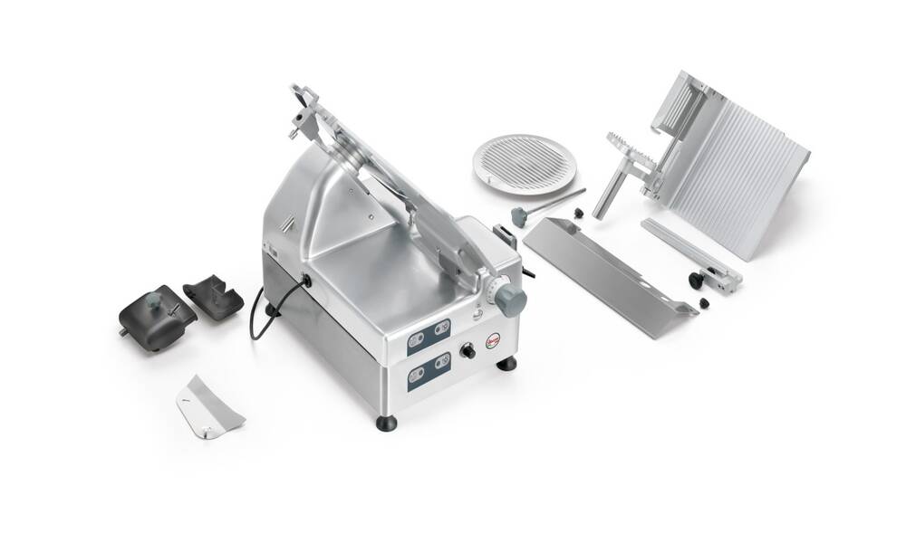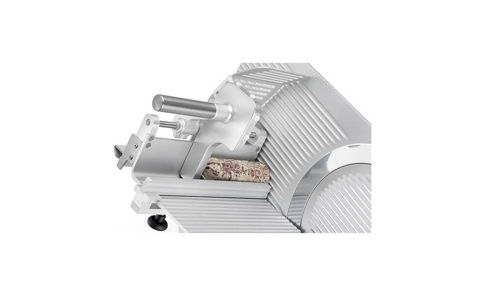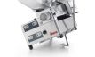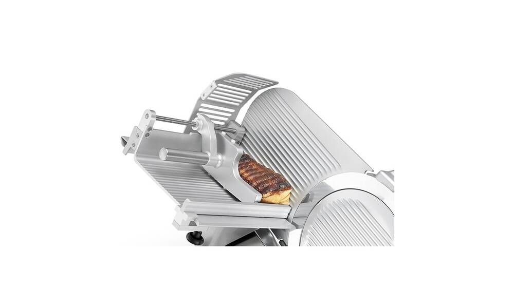 Aufschnittmaschine mit schräggestelltem Schiebetisch und automatischem Vorschub. Ausgelegt für hohe Belastungen im Dauerbetrieb.