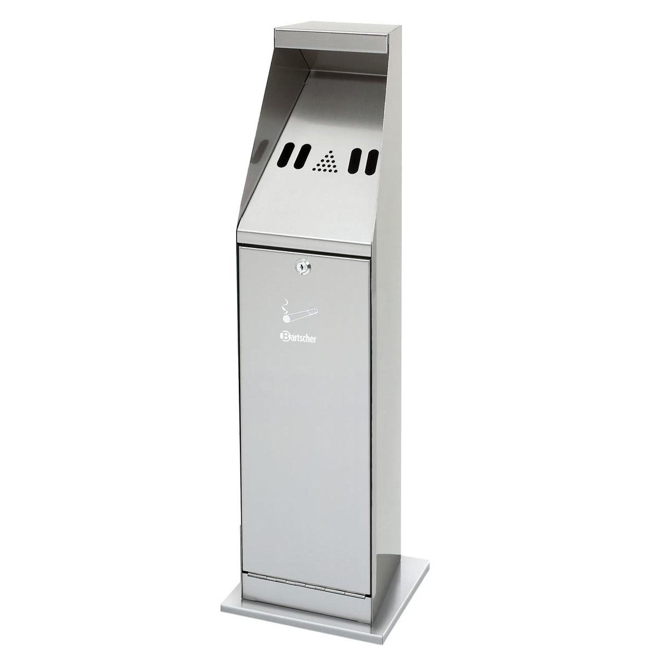 Standaschenbecher aus Edelstahl. Einfach zu montieren, abschließbar. Volumen: ca. 5,5 Liter. Abmessungen: 240 (B) x 240 (T) x 870 (H) mm. Gewicht: 8,5 kg.